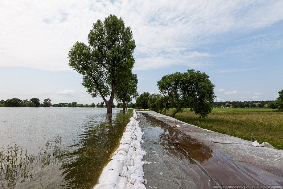 Уровень воды в районе Лостау поднялся выше основной дамбы на 30 сантиметров, и если бы не дополнительные укрепления из мешков и земляных валов, деревню давно бы уже затопило. Ситуация была критической.