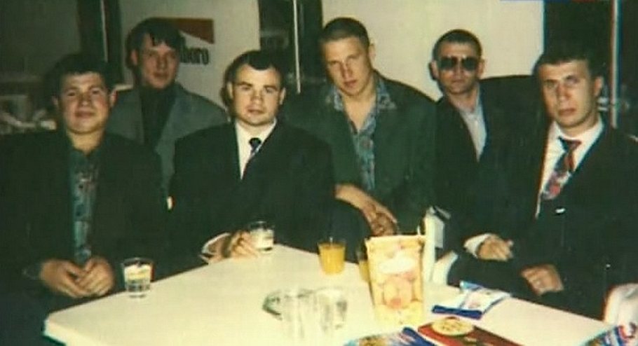 На фото: члены ОПГ Виктор Комахин (второй слева; застрелен в 1995 году) и Игорь Чернаков (третий слева; был убит в 1994 году на следующий день после убийства лидера ОПГ Сильвестра)