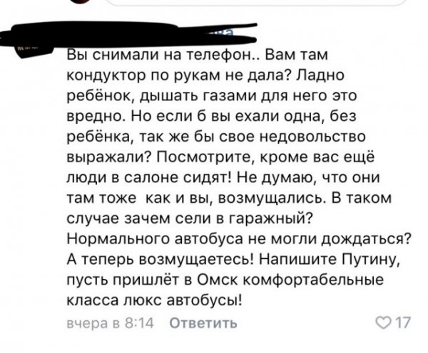 Россияне раскритиковали жительницу Омска, которая пожаловалась на ужасные условия в общественном транспорте. Многие ожесточенно принялись осуждать девушку и посоветовали ей купить автомобиль, исправно платить налоги и не ныть, так как раньше было хуже.