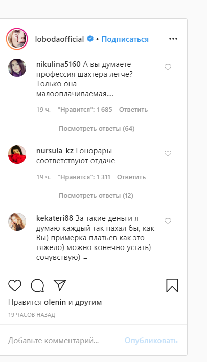 Ответы на этот провокационный вопрос были разными, и помимо сочувствия от своих поклонниц, певица дождалась и вполне справедливой критики. "Примерка платьев - как это тяжело! Можно, конечно, устать. Сочувствую. За такие деньги, я думаю, каждый так пахал бы как Вы". "На стройке не работали - там мозоли побольше". "Укладчики асфальта пашут, учителя пашут и т.д. и т.п., но, увы, бабла у них нет!! Так что не надо говорить о том, как тяжело живется нашему шоу бизнесу! За такое бабло можно и попахать, и мозоли натереть! Заживет, ниче страшного!"