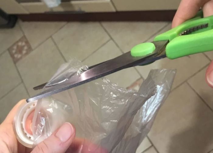 Рекомендация предельно простая. Берем обычный прозрачный целлофановый пакет, у нас такие продают рулонами за несколько десятков рублей. Понадобится всего один единственный. С одной стороны, примерно на половину длины шва делаем аккуратную прорезь. Помогут в этом деле обычные ножницы. Теперь остается только надеть пакет через сделанную прорезь на кран так, чтобы целлофан закрывал собой вентили.