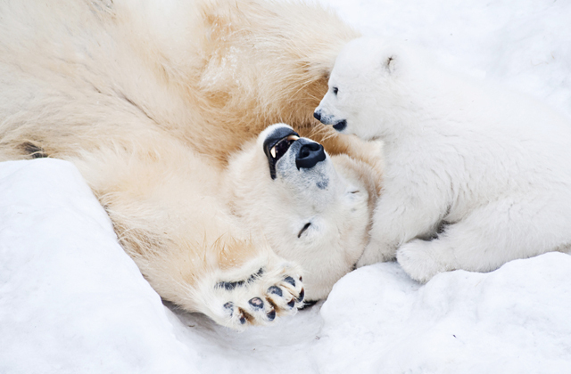 А вот самки залегают в берлоги, чтобы в самую суровую непогоду принести потомство. До рождения детенышей медведица в основном спит. Во время родов просыпается, но все равно остается в берлоге и выкармливает медвежат. В общей сложности самки могут находиться в укрытии до восьми месяцев. Детеныши остаются с матерью в среднем два года и на следующую зиму ложатся спать вместе с ней.