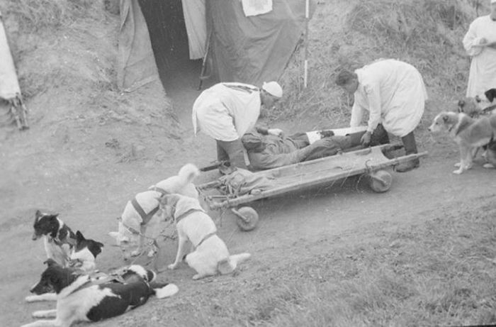 Около 700 тысяч тяжелораненых солдат были вывезены с поля боя на упряжках ездовых собак-санитаров. Животные исправно несли службу под обстрелом и взрывами снарядов, зимой они работали на нартах, а летом — на специальных тележках. В их обязанности входило не только спасение пострадавших бойцов, но и доставка боеприпасов. Участник Великой Отечественной войны Сергей Соловьев вспоминал, как из-за интенсивного огня санитары не могли пробраться к истекающим кровью однополчанам. И тогда на помощь приходили собаки. Они по-пластунски приползали к раненому с медицинской сумкой, ждали, пока тот перевяжет рану, и после этого отправлялись к другим. Если бойцы находились без сознания, четвероногий санитар облизывал ему лицо до тех пор, пока тот не очнется.