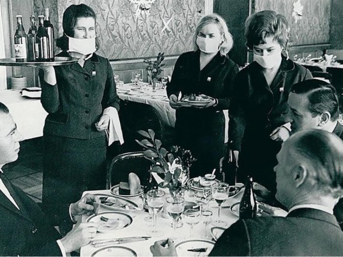 Гонконгский грипп прошелся тремя волнами (за два сезона). В СССР особых жертв не было – страна была закрытая, советские люди особо не путешествовали, а приезжих тщательно опекали. Официантки на фото как раз общаются с иностранцами.