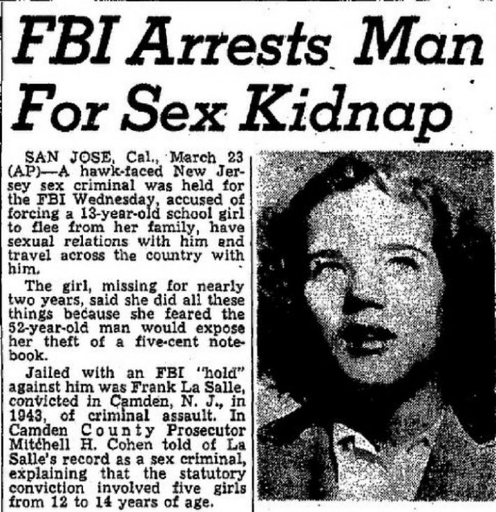 Целых два года, с 1948 по 1950 год педофил и его жертва были неразлучны. Фрэнк никуда не отпускал Салли от себя и постоянно насиловал. Чтобы не привлекать внимание, преступник заставлял девочку называть его отцом и на людях изображать дочернюю любовь и уважение. Похититель и его жертва перемещались на автомобиле по разным штатам, останавливаясь в мотелях и нигде долго не задерживаясь.