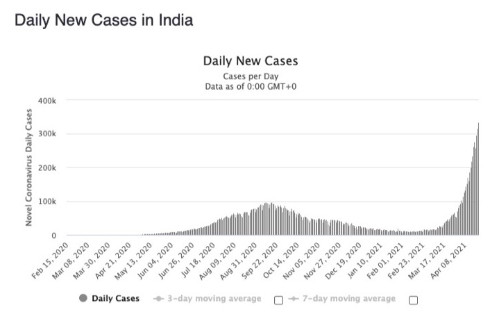 Мы уже писали, что в Индии недавно забили вообще на все меры безопасности и провели трехдневный религиозный фестиваль. Миллионы паломников приехали со всей страны, обкашляли друг друга, а потом разъехались по всей стране. И через несколько дней начался апокалипсис. Вчера официально зафиксировали 330+ тыс новых случаев заражения. Важно понимать, что тесты там не ставят вообще всем. Нет, обычно это обращения людей уже с симптомами, а часто с тяжелым состоянием (если отвары трав и чеснок в нос не помогли). Просто лавина новых случаев.