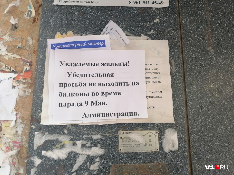 - Уважаемые жильцы! Убедительная просьба не выходить на балконы во время парада 9 Мая, - гласит объявление, под которым подписано «Администрация».