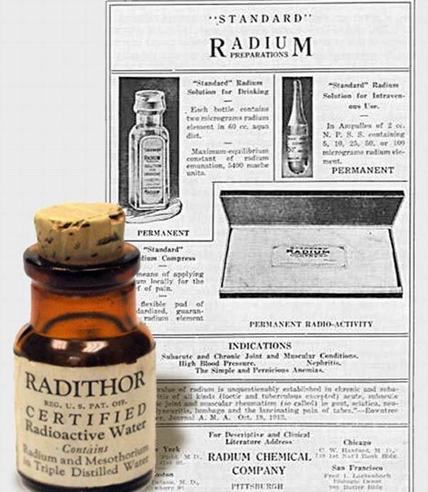 Другое дело энергетический напиток «Радитор», представленный в 1918 году брендом Bailey Radium Laboratories из Нью-Джерси, США. В состав продукта входили всего три простых компонента и никаких Е и прочих усилителей вкуса и красителей: