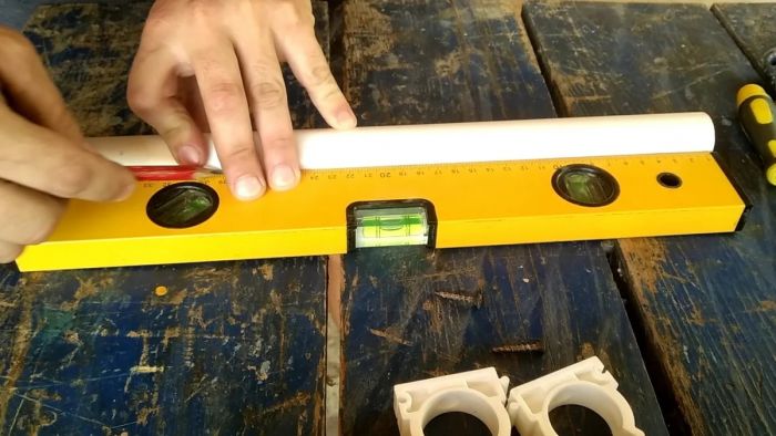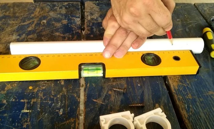 Первым делом необходимо начертить ровную линию на трубе, для этого кладём уровень на ровную поверхность, приставляем к нему трубу и карандашом проводим линию.