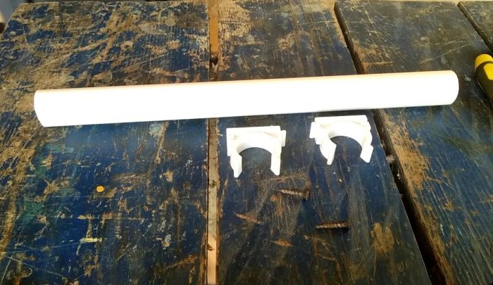 Для самоделки понадобится отрезок 32-той полипропиленовой трубы, длину нужно подобрать индивидуально, всё зависит от выделенного места и количества инструмента. Так-же, понадобится 2 клипсы, шурупы и вспомогательный инструмент.