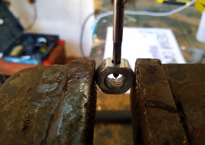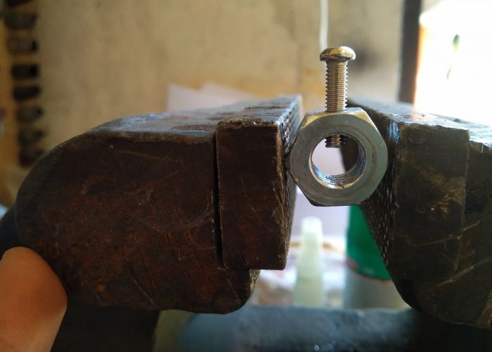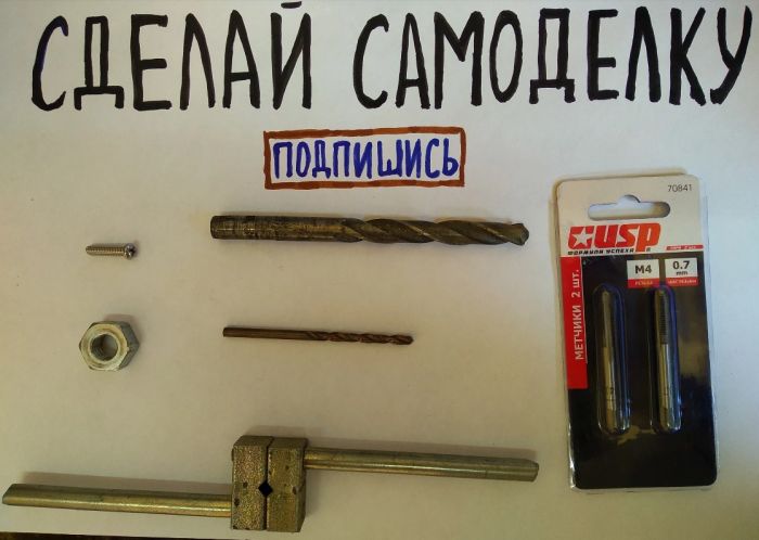Берём метчик и нарезаем резьбу. Думаю визуально будет понятно какие нужно свёрла, гайка и болтик, если нет, то в комментариях объясню подробней! ))