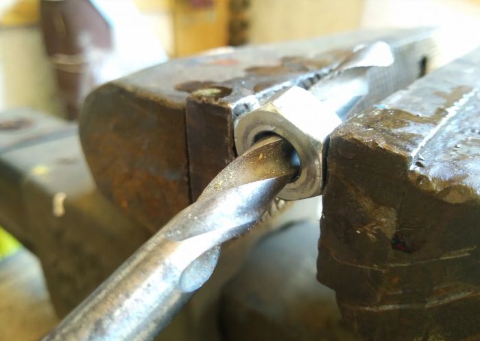 Как я писал выше, необходимо взять гайку меньшего диаметра и рассверлить резьбу светлом для которого будем делать самоделку. Это нужно для того, что бы сверло плотно входило в гайке и не болталось