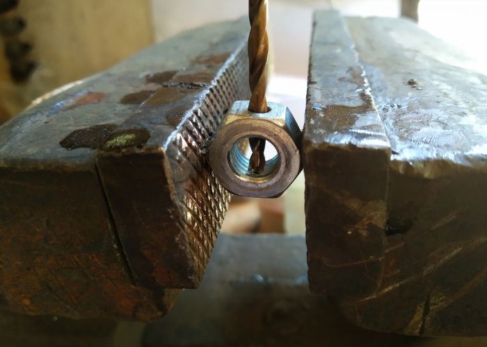 Далее берём сверло по меньше и сверлим отверстие для нарезки резьбы, на ровной части гайки с торца!