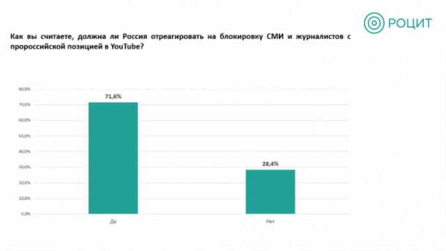 В качестве основного вопроса респондентов спрашивали, знают ли они, что YouTube блокирует каналы государственных СМИ РФ, и что они думают по поводу возможной блокировки. Онлайн-опрос показал, что почти 80% опрошенных знают о действиях видеохостинга, а 70% из них считают их откровенной цензурой.