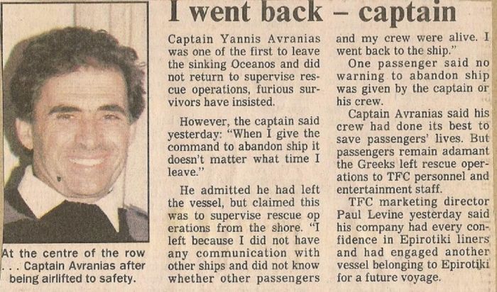 Капитан Янис Авраниас был обвинен пассажирами в раннем оставлении судна и неоказании им помощи при эвакуации. Авраниас со своей стороны утверждал, что покинул судно одним из первых для того, чтобы координировать спасательную операцию с борта вертолета.