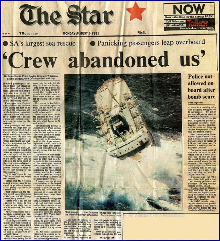 ЗатоплениеПримерно в 21.30 пассажиры судна услышали приглушенный хлопок и теплоход потерял тягу. Согласно отчетам, примерно в 21:30 лайнер MTS Oceanos находился близ побережья южно-африканской республики Транскей, когда в машинном отделении раздался приглушенный взрыв. Он остановил работу двигателей и образовал небольшую пробоину в корпусе. Поступающая вода закоротила генераторы. 10-сантиметровое отверстие в переборке, оставшееся после ремонта, позволило воде проникнуть в канализационный бак; оттуда морская вода побежала через главные дренажные трубы и начала подниматься из каждой ванной комнаты, душа и туалета на уровне нижней палубы лайнера.