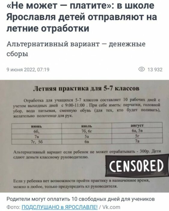 В одной из школ Ярославля родители школьников 5-7 классов получили письма счастья о том, что их отпрыски должны по 20 часов каждый прокорячиться на уборке пришкольных территорий. А тем, кто помнит, что эксплуатация детей запрещена, предлагается занести классному руководителю 300 рублей. Будут ли во время уборки проводиться торжественные церемонии поднятия флага и исполнения гимна или Марша Энтузиастов, для поднятия трудового духа учащихся, не уточняется.