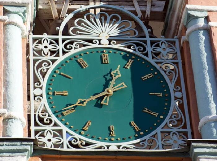 Все это было не слишком-то удобно. А потому в 1704 году Петр I заказал в Амстердаме новые «европейские» часы с вращающимися стрелками. Хотя куранты неоднократно горели, отреставрированный старинный циферблат на 17 часов сохранился, и сегодня его можно увидеть в Александрове в Палатах Ивана Васильевича. Многих также наверняка заинтересуют загадочные буквы, нанесенные на нем над арабскими цифрами. На самом деле ничего таинственного в них нет. Это старославянские цифры, которые обозначались буквами. В буквах «зашифрованы» все те же значения от 1 до 17.
