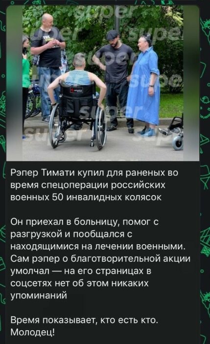 Инсайдер из команды рэпера объяснил, что Тимати привёз около 50 инвалидных кресел в Главный военный госпиталь имени Бурденко, где сейчас находятся раненые солдаты, вернувшиеся с Украины. О причинах такого поступка рэпер пока не сообщил — в его социальных сетях нет упоминаний о благотворительной акции.