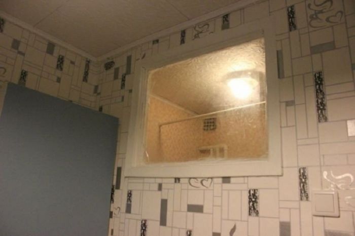 Окно между ванной и кухней Оно до сих пор встречается в некоторых квартирах. Согласитесь, что его существование совершенно не поддается никаким логическим объяснениям. Эти окна либо закладывали плиткой, либо просто занавешивали красивой тканью. Но объяснение такой планировке все-таки есть.