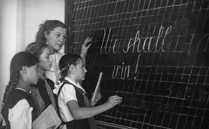 А английский… На нем разговаривали рабовладельцы, колонизаторы и угнетатели, загнивающие американские капиталисты и прочие классовые враги. Этот язык преподавали в университетах будущим дипломатам, филологам и прочими специалистам, имеющим дело с англосаксами. Вторая мировая война сильно подорвала позиции немецкого языка. Школьники категорически отказывались изучать язык немецких захватчиков, ведь смерть и боль пришли в каждую советскую семью. В школах же немецкий язык оставался основным иностранным и учителям приходилось нелегко. Детям было трудно объяснить, что язык ни при чем и все дело в людях, которые находятся у власти.