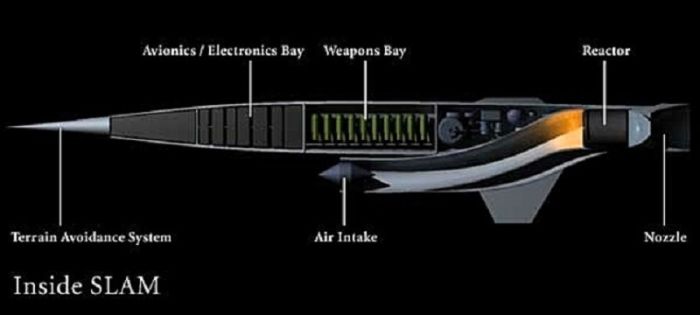 За вполне обыденной аббревиатурой Supersonic Low–Altitude Missile скрывалось чудовище, построенное вокруг прямоточного двигателя, в котором воздух нагревался ядерным реактором. Идея была в том, что атомный реактор обеспечивал практически неограниченный запас хода, так что ракету можно было на месяцы и годы оставить нарезать круги где–нибудь над океаном, а в нужный момент подать сигнал для атаки цели.