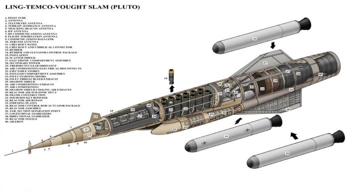 50-х годах мечта о всесильной атомной энергии (атомных автомобилях, самолётах, космических кораблях, атомном всё и вся) уже была поколеблена осознанием опасности радиации, но всё ещё витала в умах. После запуска спутника американцы обеспокоились тем, что Советы могут быть впереди не только в ракетах, но и в противоракетах, и в Пентагоне пришли к выводу о необходимости постройки беспилотного атомного бомбардировщика (или ракеты), который сможет преодолевать ПВО на низкой высоте. То, что они придумали, назвали SLAM (Supersonic Low-Altitude Missile) – сверхзвуковая низковысотная ракета, которую планировалось оснастить прямоточным ядерным двигателем. Проект получил название «Плутон».