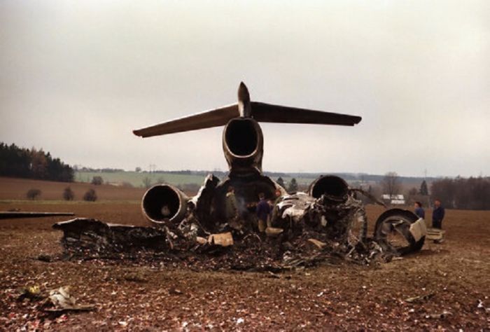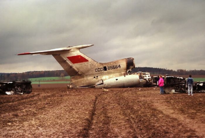 Самолёт коснулся земли через 13 минут с момента первого сообщения о пожаре. Сразу после касания горящий Ту-154 врезался в полутораметровую насыпь асфальтированной дороги. В это время по дороге ехал автомобиль, который успел затормозить прямо перед лайнером. При ударе оторвалась носовая стойка шасси, а самолёт подскочил вверх и врезался в провода ЛЭП, разрушившись на несколько частей. При этом, передняя часть фюзеляжа с находящимся в ней экипажем до того как остановиться совершила три оборота. Тем не менее, все шестеро человек на борту выжили и сумели выбраться самостоятельно. КВС отделался переломом рёбер, второй пилот травмой головы, а штурман переломом ключицы. Самолёт приземлился на территории Чехословакии в районе деревни Дубенец. Груз (сигареты) был, по