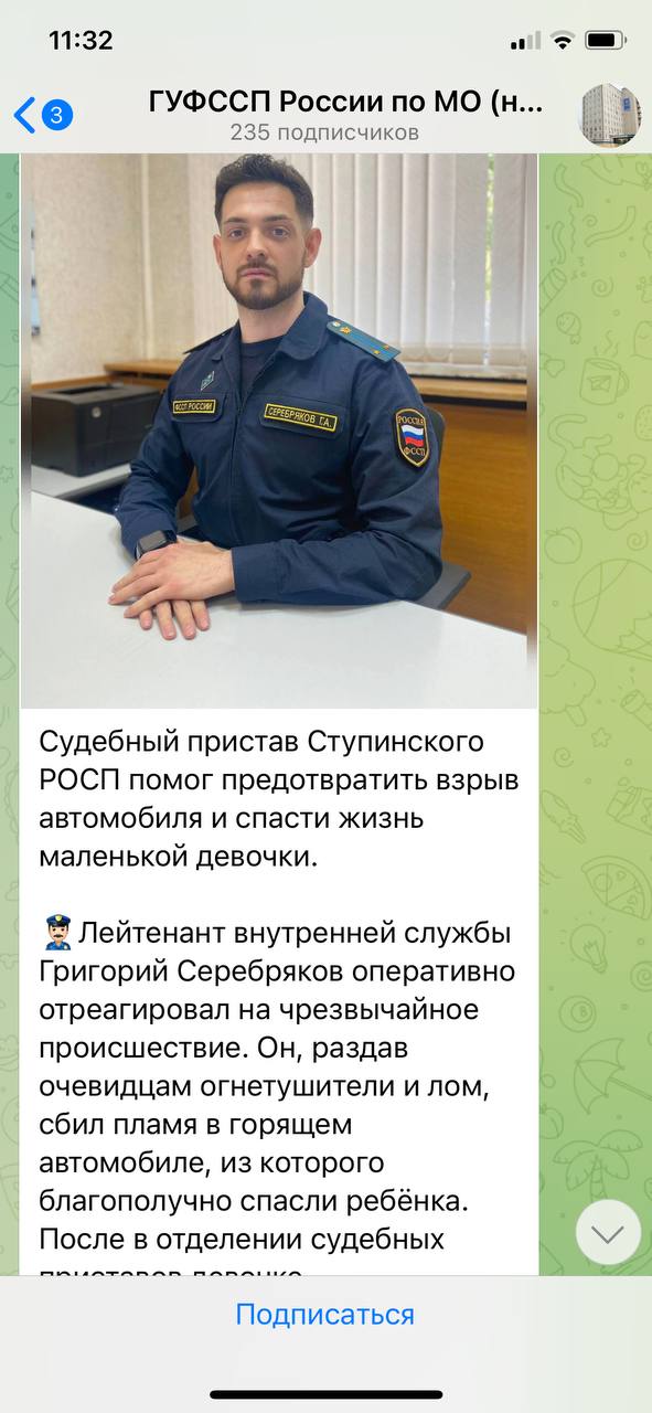 Но оказалось, что у Ступинского отделения судебных приставов есть своя версия произошедшего. Ведомство написало в соцсетях, что их начальник Григорий Серебряков «помог предотвратить взрыв автомобиля и спасти жизнь маленькой девочки. Серебряков оперативно отреагировал на чрезвычайное происшествие. Он, раздав очевидцам огнетушители и лом, сбил пламя в горящем автомобиле, из которого благополучно спасли ребёнка». Позднее такую же версию в своих соцсетях опубликовала и ФСПП России.