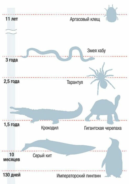 Многие животные в состоянии анабиоза могут обходиться без пищи неопределенно долго. Так, оттаяли и ожили сибирские углозубы (они же четырехпалые тритоны), извлеченные из пластов вечной мерзлоты возрастом 80–100 лет.