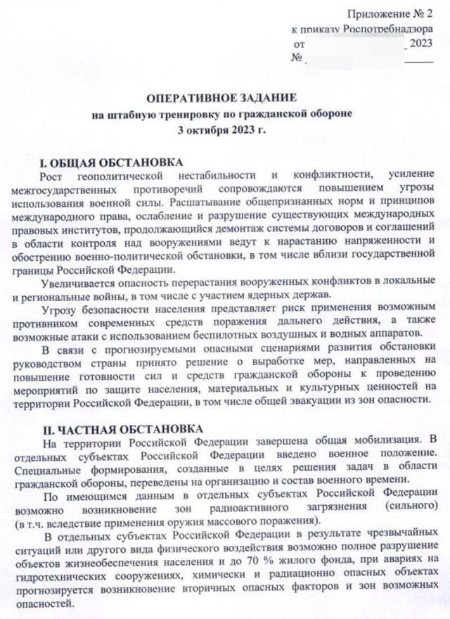 Штабная тренировка, согласно указу главы Роспотребназора Анны Поповой, назначена на 3 октября. Как указано в документе, в условиях расшатывания общепризнанных норм и принципов международного права растёт опасность вооружённых конфликтов с участием ядерных держав, в том числе вблизи границ России.