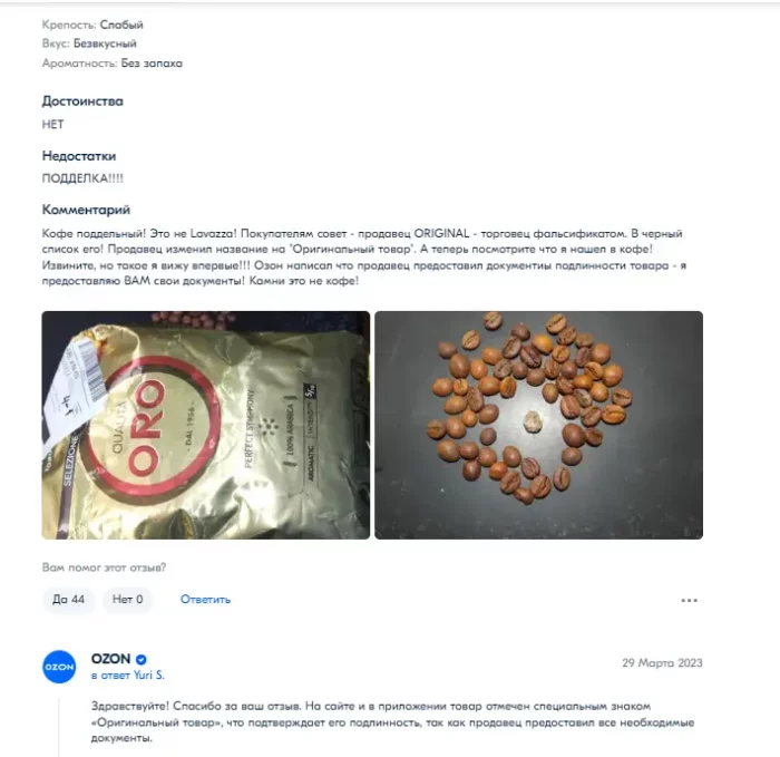 В отзывах к кофе с плашкой «Оригинальный товар» покупатели часто жалуются на качество. Странный вкус с запахом семечек, неоднородная обжарка и посторонние предметы в пачках — вот неполный список того, с чем сталкиваются люди.