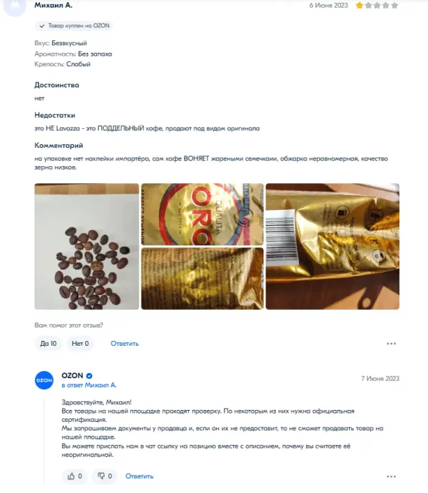 Ozon указывает, что их специалисты «проверяют документы и фотографии товаров, но не сам товар продавца». Получается, можно купить пачку кофе в супермаркете, сфотографировать и получить подтверждающую метку, а основную партию товара заказать в другом месте.