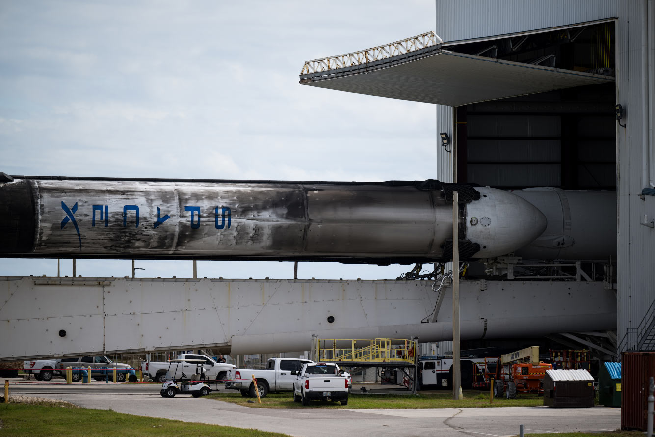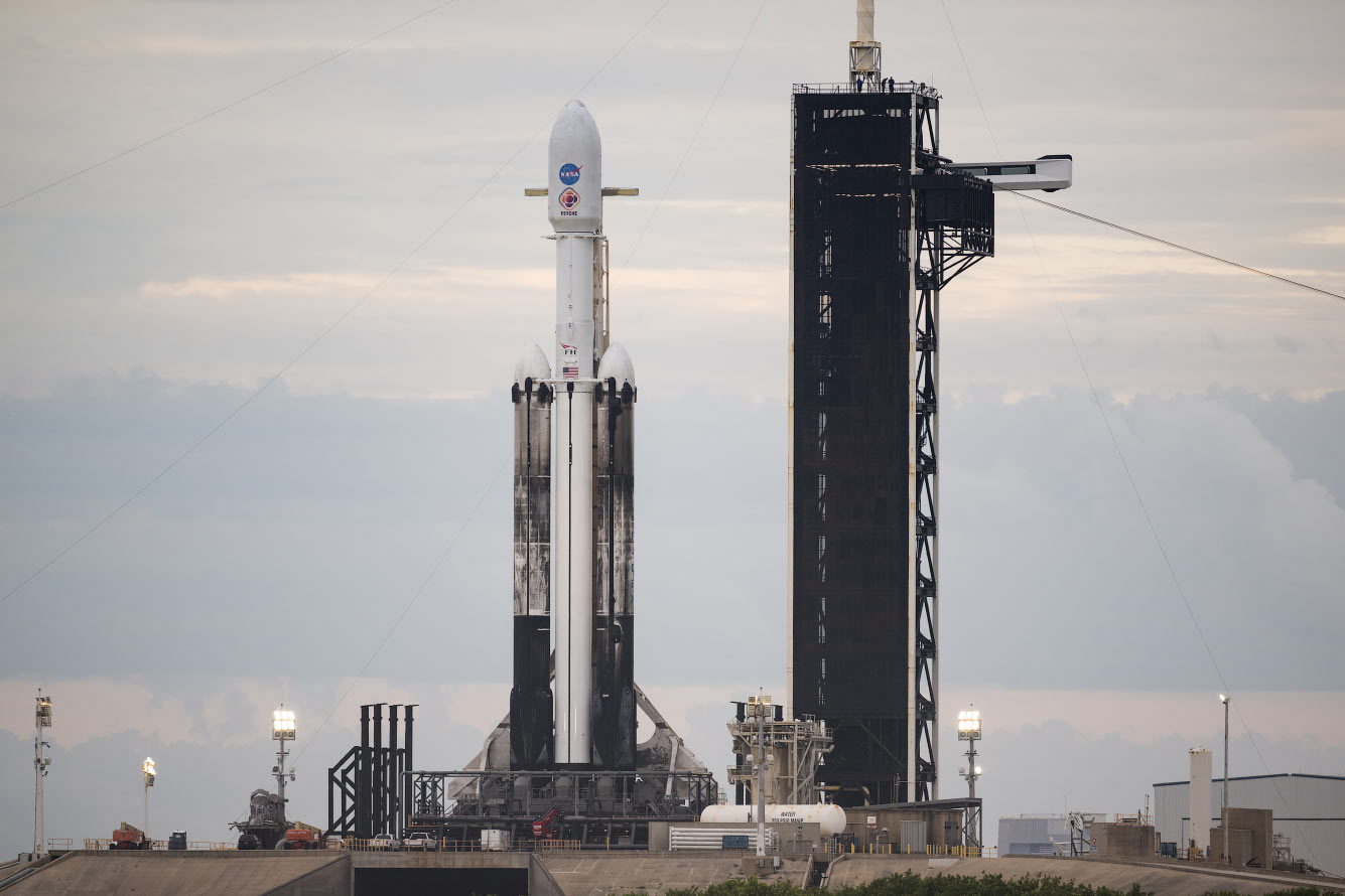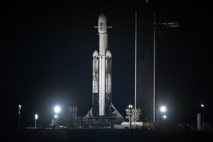 Ракета SpaceX Falcon Heavy с космическим кораблем Psyche на борту на стартовом комплексе 39A, пока продолжается подготовка к миссии Psyche, среда, 11 октября 2023. (Фото NASA/Aubrey Gemignani):