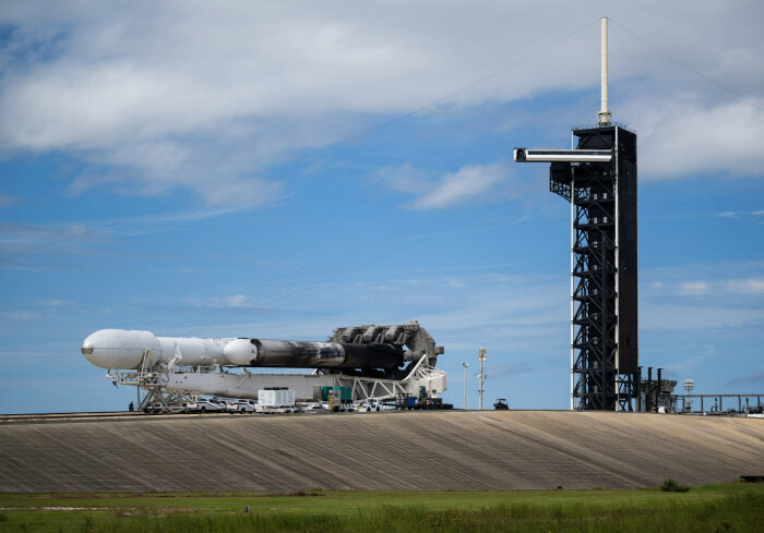 Ракета SpaceX Falcon Heavy с космическим кораблем Psyche на борту видна на стартовом комплексе 39A, 11 октября 2023 года. (Фото NASA/Aubrey Gemignani):