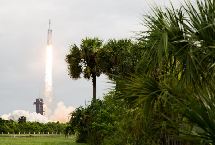 Старт ракеты SpaceX Falcon Heavy с космическим кораблем Psyche на борту со стартового комплекса 39А в пятницу, 13 октября 2023. (Фото (NASA/Aubrey Gemignani):