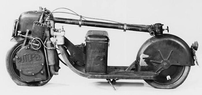 У первого автопеда двигатель крепился поверх переднего колеса, а само устройство было более массивным и тяжелым, чем современные скутеры. В остальном транспортное средство было вполне похоже на те самокаты, которыми сегодня заполнены улицы городов.