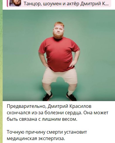 Танцор и шоумен Дмитрий Красилов найден мертвым в Москве 19/12/2023 09:30 В Москве скончался танцор, шоумен и актер Дмитрий Красилов. Об этом сообщает источник РЕН ТВ.Красилов стал известен благодаря клипу Uno от группы Little Big. Главная / Статьи 0 Admin 2 406