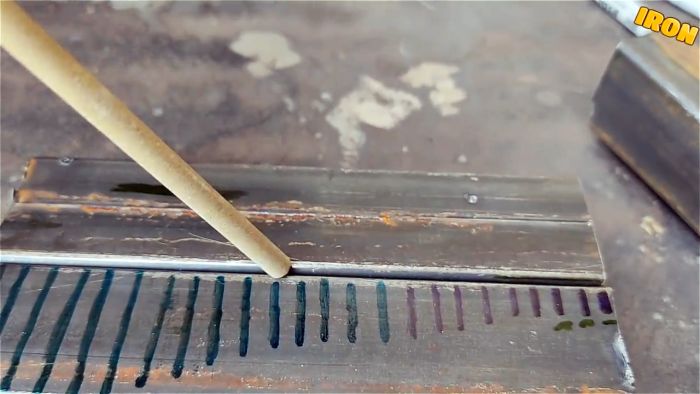 Покажем движение конца электрода вдоль будущего сварочного шва, ориентируясь на полоски. Устанавливаем электрод на первую полоску, имитируя этим зажигание дуги. Ведем его до четвертой и возвращаем на вторую.