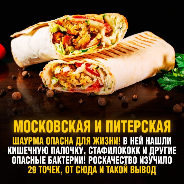 Роскачество изучило точки продажи шаурмы в Москве и Петербурге и пришло к неутешительным выводам. Почти во всех заведениях общепита есть кишечная палочка, а в некоторых даже нашли листерию и золотистый стафилококк. Будьте аккуратны со здоровьем.