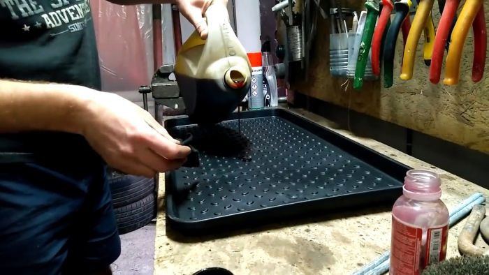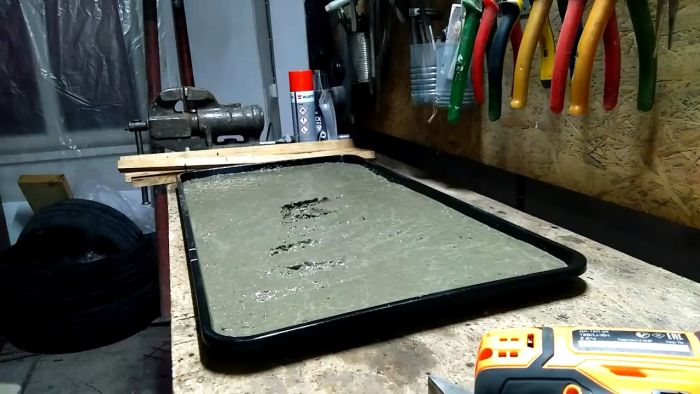 Нужно подобрать пластиковую форму, в которую будет заливаться бетон. Ее высота должна быть как минимум 20 мм (в данном примере использован обувной поддон).