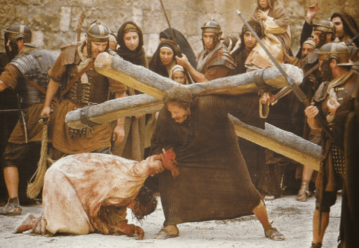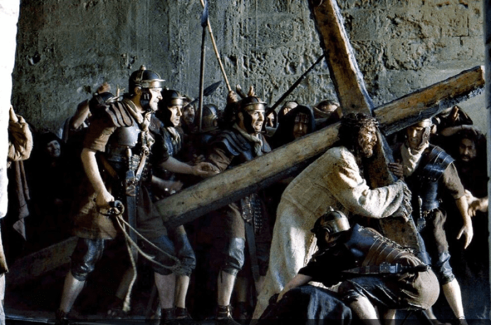 После бичевания на Иисуса вновь надели одежду и заставили нести крест. Вес креста оставлял более 50 кг. Нести такой груз было тяжело даже здоровому человеку, а тому, кто был подвергнут бичеванию, было совсем невмоготу. Путь Христа до Голгофы составлял более полкилометра.