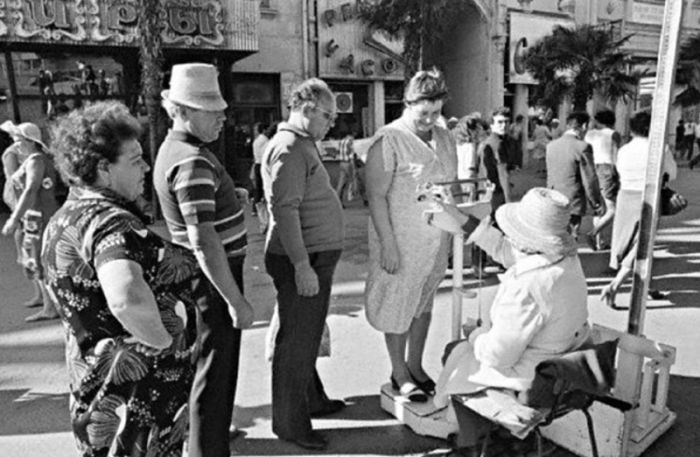Чтобы узнать свой вес, граждане отправлялись на улицу. Там можно было встретить человека в белом медицинском халате, стоящего возле больших медицинских весов. Встречались они в парках, возле рынков и больших магазинов. Стоимость взвешивания была символической и желающих всегда хватало.