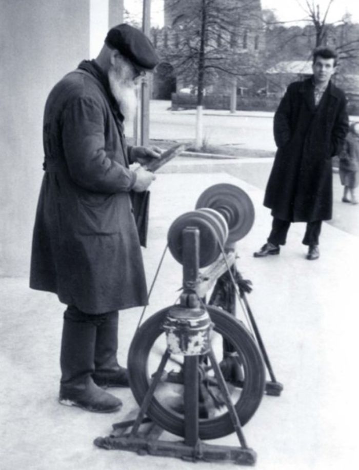 В 60-х годах на улицах советских городов появились будки, в которых сидели точильщики. Эти специалисты предлагали профессионально заточить ножи, ножницы и даже опасные бритвы. Были и мастера, оказывающие услуги без помещения — их станки устанавливались просто на тротуаре.