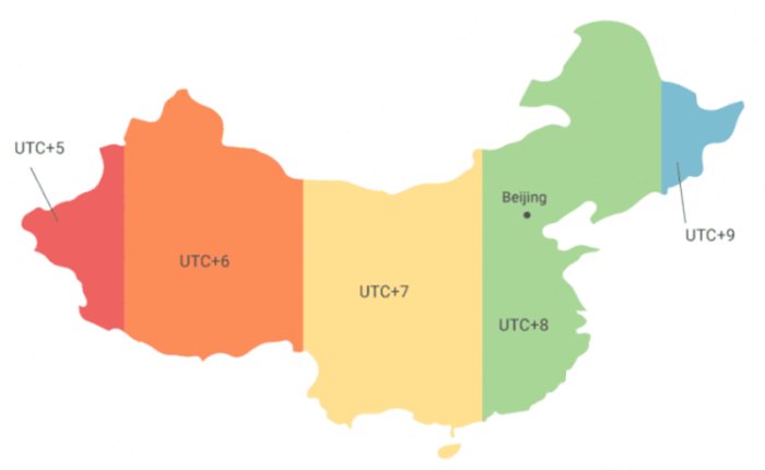 КНР от других стран отличается многим, в том числе и вопросом времени в прямом смысле этого слова. Здесь во временном вопросе не действуют ни научные, ни мировые законы. Отсчитываются часы исключительно по административному внутреннему регламенту. Везде одно и то же время суток. И это при том, что страна расположена в пяти часовых поясах.
