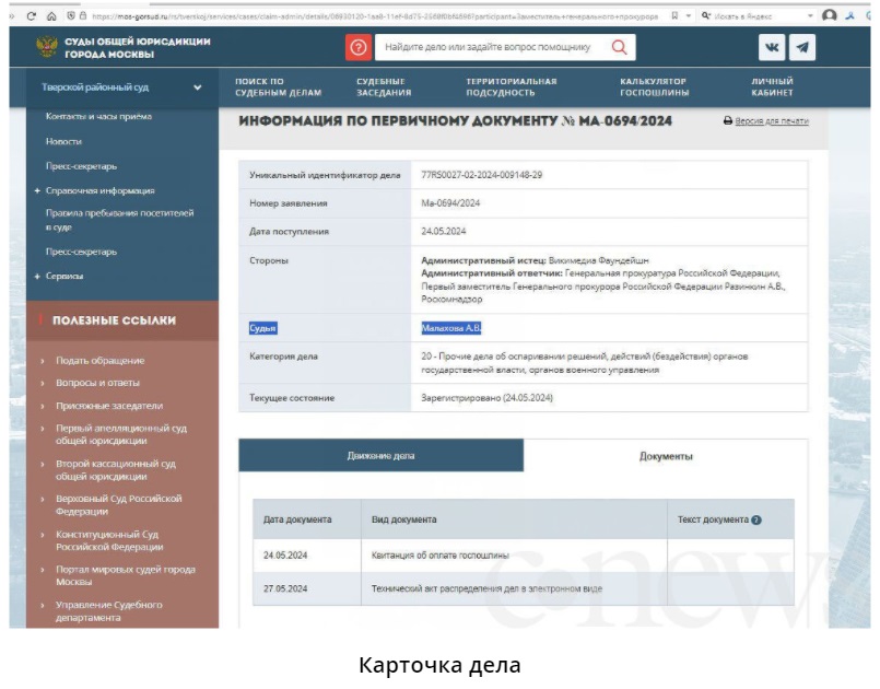 В общей сложности, пишут «Ведомости», Тверской райсуд зарегистрировал сразу три исковых заявления Wikimedia Foundation. Все они направлены против первого заместителю генерального прокурора Анатолию Разинкину.