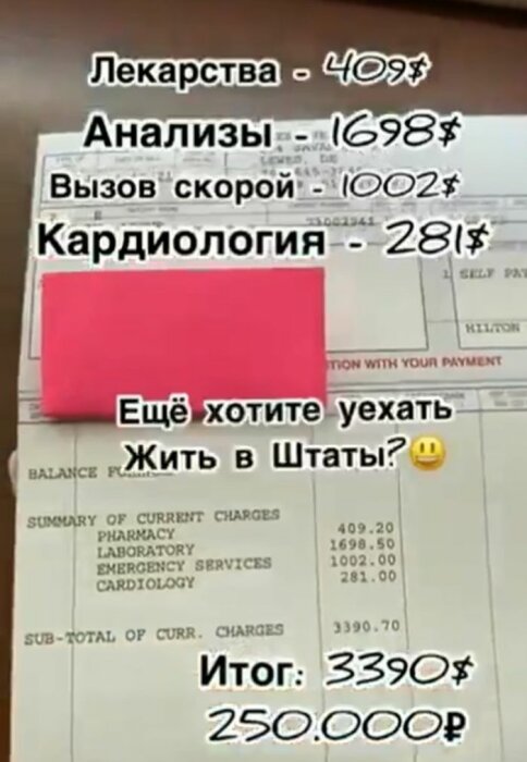 "В США практически нет муниципальных услуг скорой помощи, как правило, этим занимаются лишь частные медицинские организации. По состоянию на май 2021 года, вызов скорой помощи стоит от 600 до 2 000 долларов в зависимости от штата. Стоимость услуги составляет практически половину от заработной платы американца. Конечно, если у человека нет денег, то его не оставят без медицинской помощи. Но после выписки стоимость вызова скорой помощи будет включена в общий счет лечения, улизнуть от оплаты долга не получится. Причем стоит отметить, что медицинские страховки редко покрывают вызов скорой.