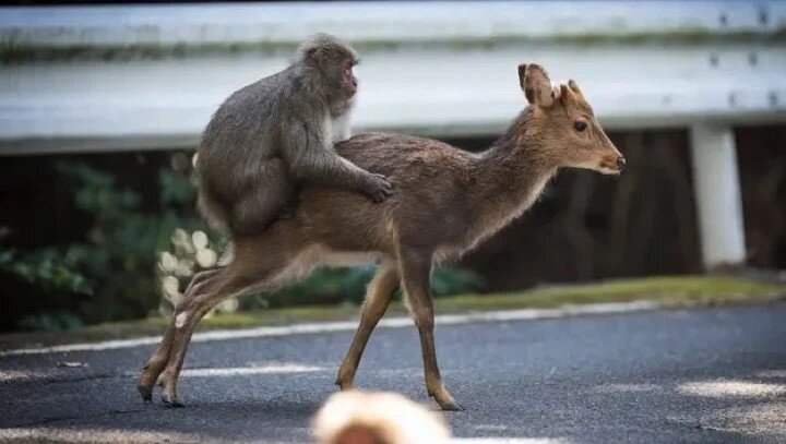 На японском острове Якусима макаки, как известно, ездят на оленях в качестве транспорта, а взамен чистят оленей и делятся с ними едой.