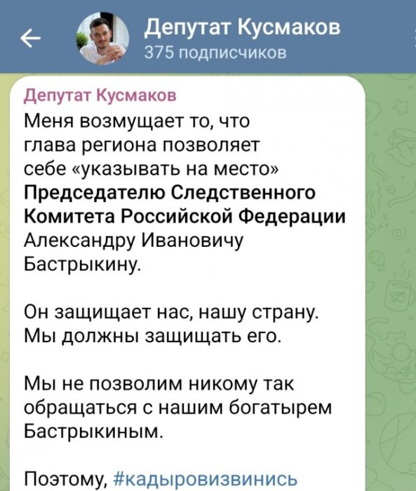 Сергей Кусмаков опубликовал сообщение, в котором раскритиковал действия Рамзана Кадырова и его комментарий по отношению к Александру Бастрыкину. Публикация сопровождалась хэштегом «КадыровИзвинись».