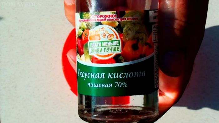 Для легкого удаления сорняков между плитками, нужно их предварительно обработать самодельным раствором. Для этого необходимо развести уксусную эссенцию 70% в воде в соотношении 1:3. В раствор добавляется столовая ложка соли и 8-10 капель моющего средства. Последний компонент нужен для лучшего прилипания средства к листьям.